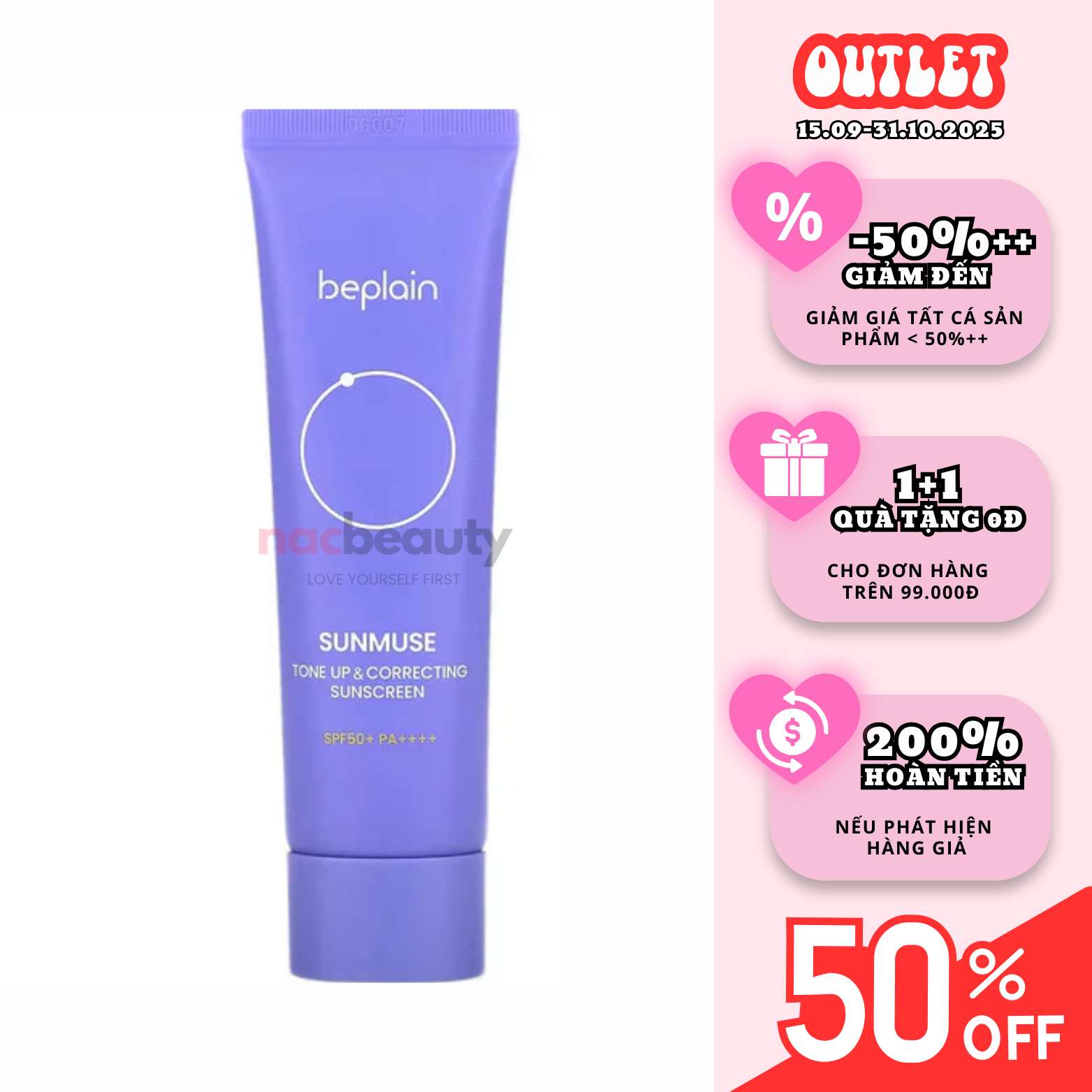 Beplain Sunmuse Tone Up & Correcting Sunscreen SPF50+ PA++++ 50ml là kem chống nắng 3in1 (kem lót, kem nền, kem che khuyết điểm) với chỉ số SPF50+ PA++++, bảo vệ da hiệu quả khỏi tia UVA/UVB. Chiết xuất từ cà rốt tím (Purple Carrot Extract) giúp hiệu chỉnh tông da không đều màu, nâng tone da tự nhiên và cung cấp độ ẩm, mang lại làn da căng bóng, mềm mịn. Kết cấu dạng sữa mỏng nhẹ, thẩm thấu nhanh, không gây bết dính và chống nước, chống mồ hôi.