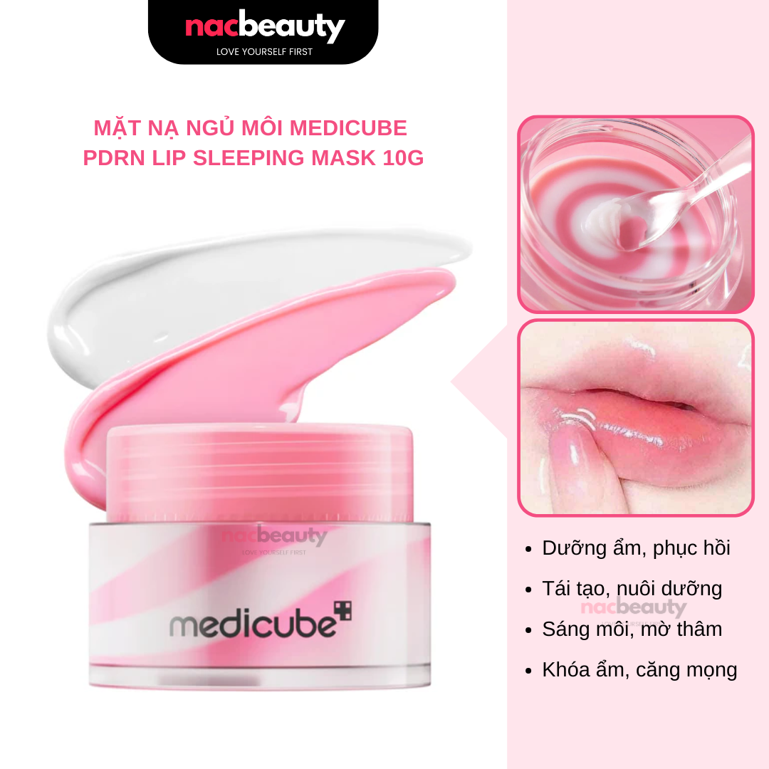 Mặt Nạ Ngủ Môi Medicube PDRN Lip Sleeping Mask 10g đến từ thương hiệu Medicube Hàn Quốc, là giải pháp dưỡng môi chuyên sâu vào ban đêm. Với công thức chứa PDRN (DNA cá hồi) cùng các dưỡng chất thiên nhiên, sản phẩm giúp tái tạo, phục hồi và nuôi dưỡng đôi môi khô nứt, thâm sạm. Kết cấu mềm mịn, bám môi nhẹ nhàng, tạo lớp màng dưỡng ẩm suốt đêm, mang lại đôi môi căng mọng, hồng hào và tràn đầy sức sống. NAC Beauty hiện phân phối chính hãng sản phẩm tại Việt Nam, đảm bảo chất lượng và an toàn cho người dùng.